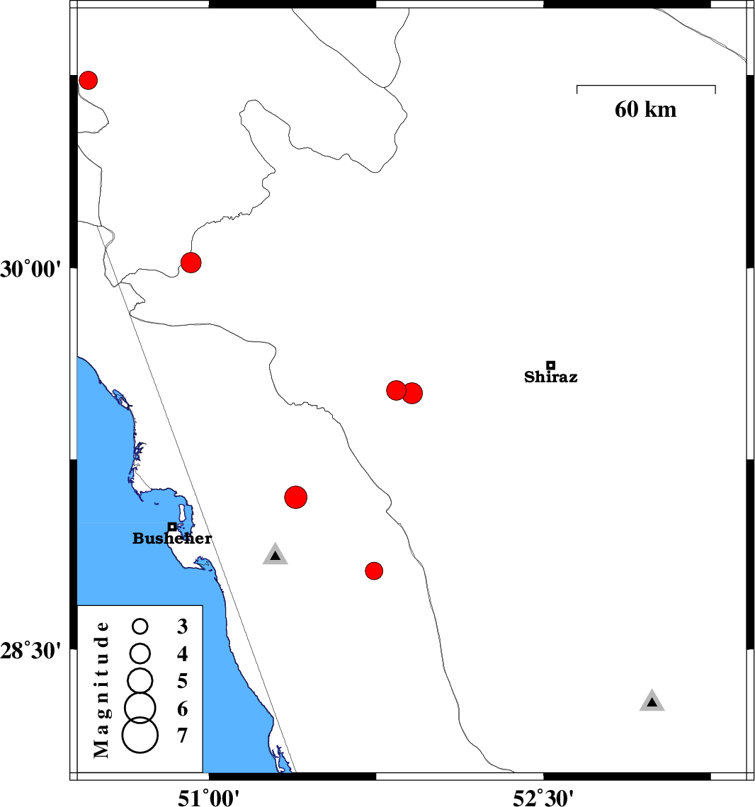 | 2008/10/24 | 05:22:57.9 | 08:52:57.9 | 29.51 | 51.91 | 16 | ML4.2 | 28 km South-East of Kazerun, Fars Province | ||