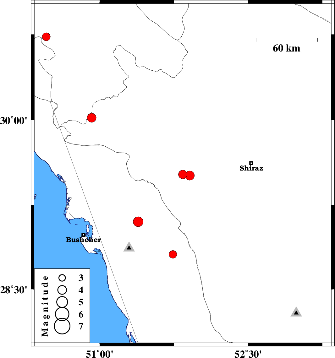 | 2008/10/24 | 05:22:57.9 | 08:52:57.9 | 29.51 | 51.91 | 16 | ML4.2 | 28 km South-East of Kazerun, Fars Province | ||
