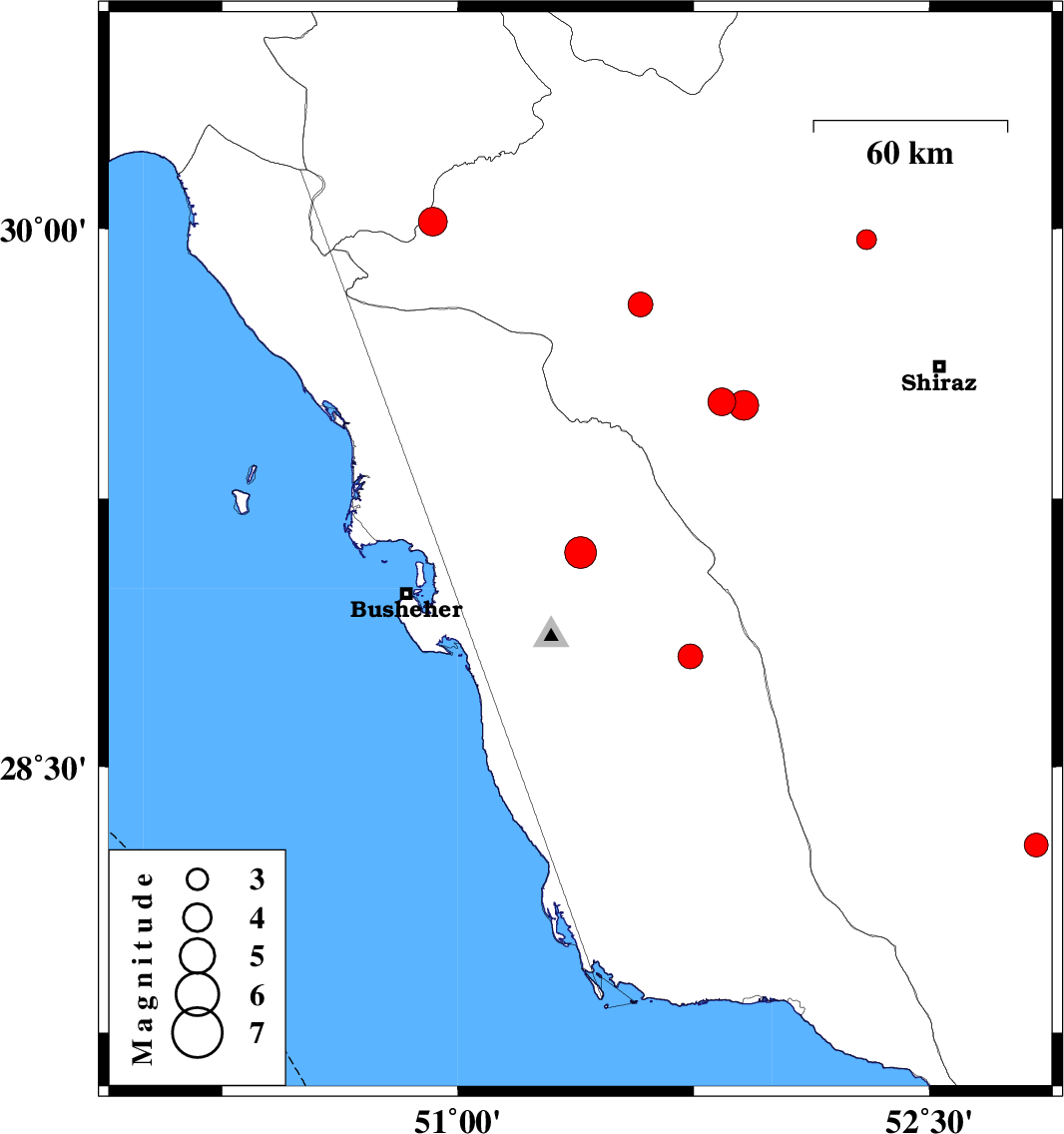 2008/10/19 | 00:53:21.7 | 04:23:21.7 | 28.81 | 51.74 | 15 | ML3.5 | 34 km West of Farashband, Fars Province | ||