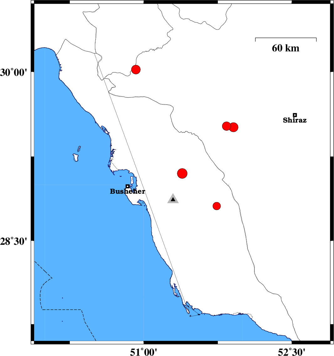 2008/10/24 | 05:22:57.9 | 08:52:57.9 | 29.51 | 51.91 | 16 | ML4.2 | 28 km South-East of Kazerun, Fars Province | ||