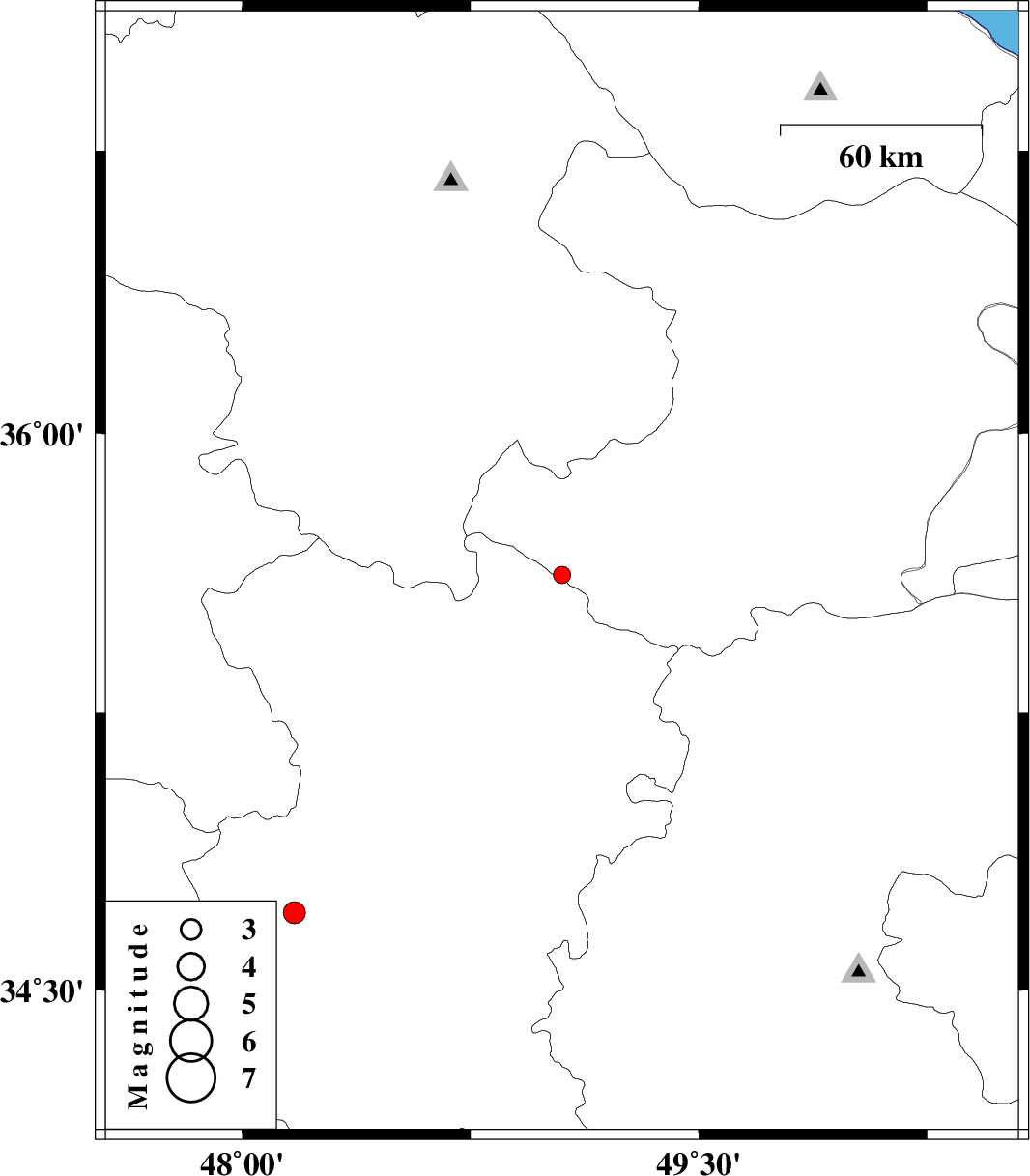 2008/10/19 | 08:24:21.5 | 11:54:21.5 | 34.71 | 48.17 | 14 | ML3.2 | 9 km Asad Abad, Hamedan Province |