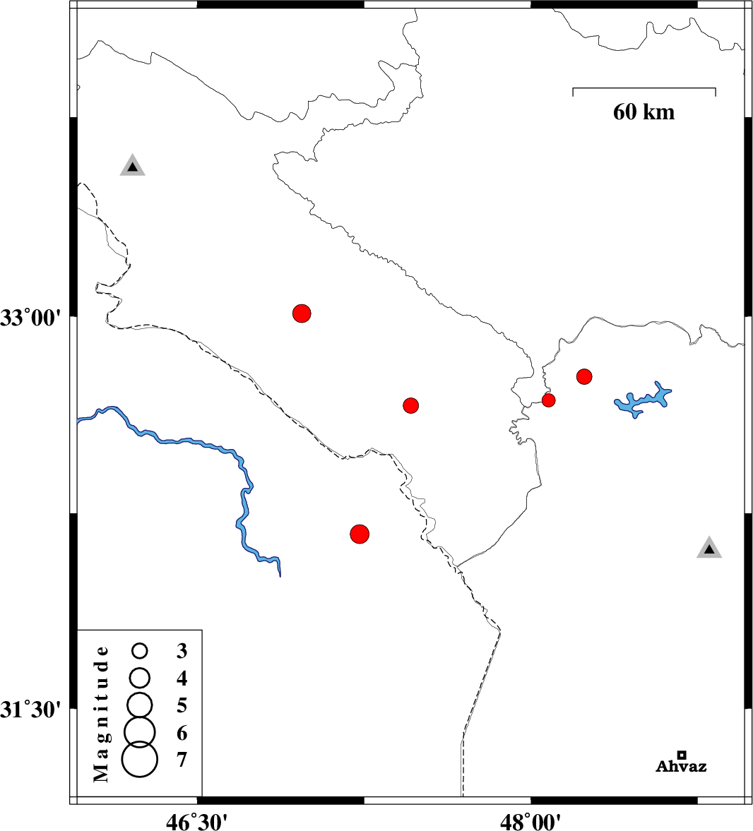 2008/10/18 | 23:50:06.1 | 03:20:06.1 | 32.17 | 47.23 | 37 | ML3.8 | 57 km South of Dehloran, Ilam Province |