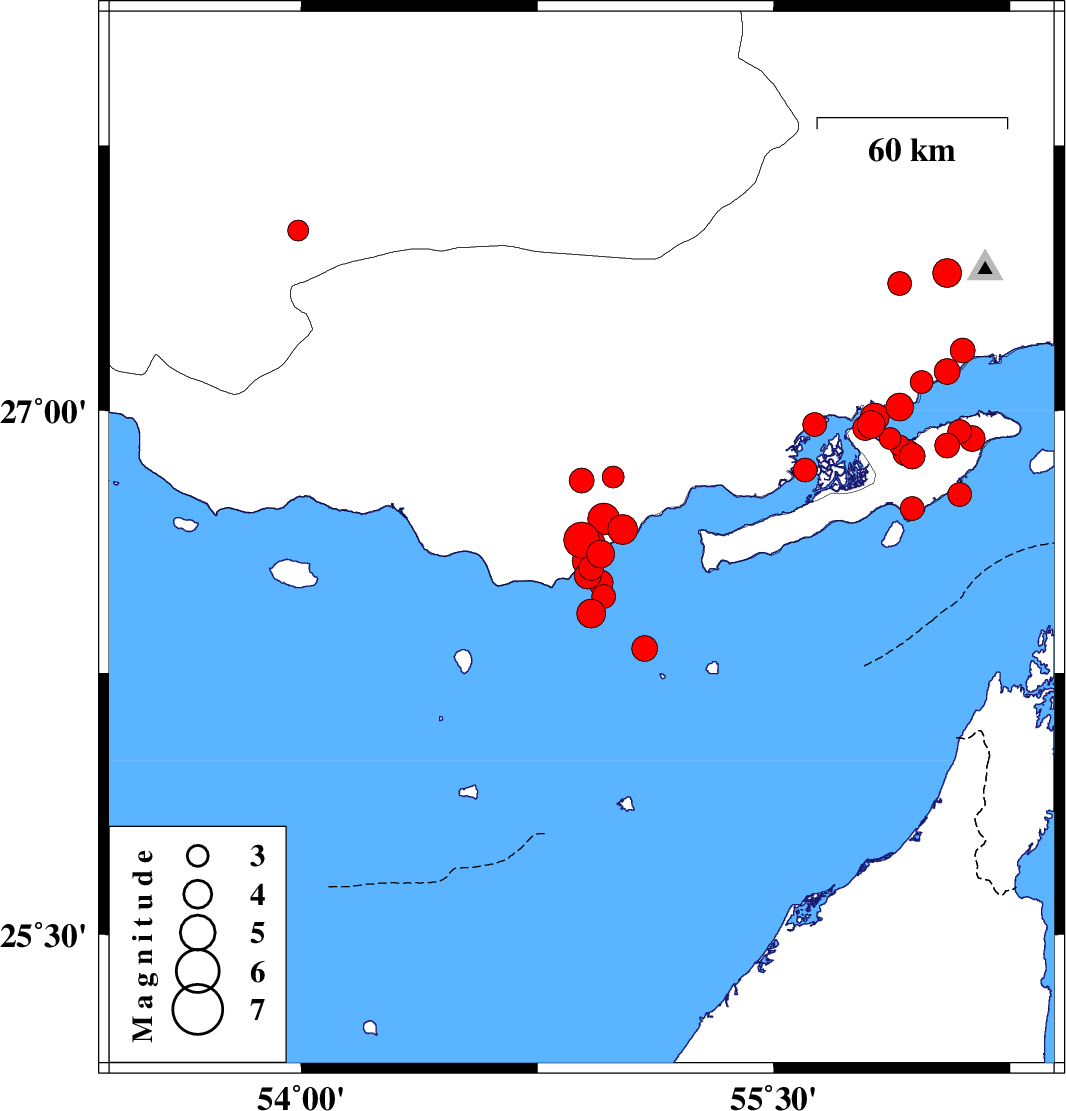 2008/10/04 | 17:12:57.1 | 20:42:57.1 | 27.01 | 55.9 | 2 | ML4 | Persian Gulf, 36 km West of Qeshm | ||