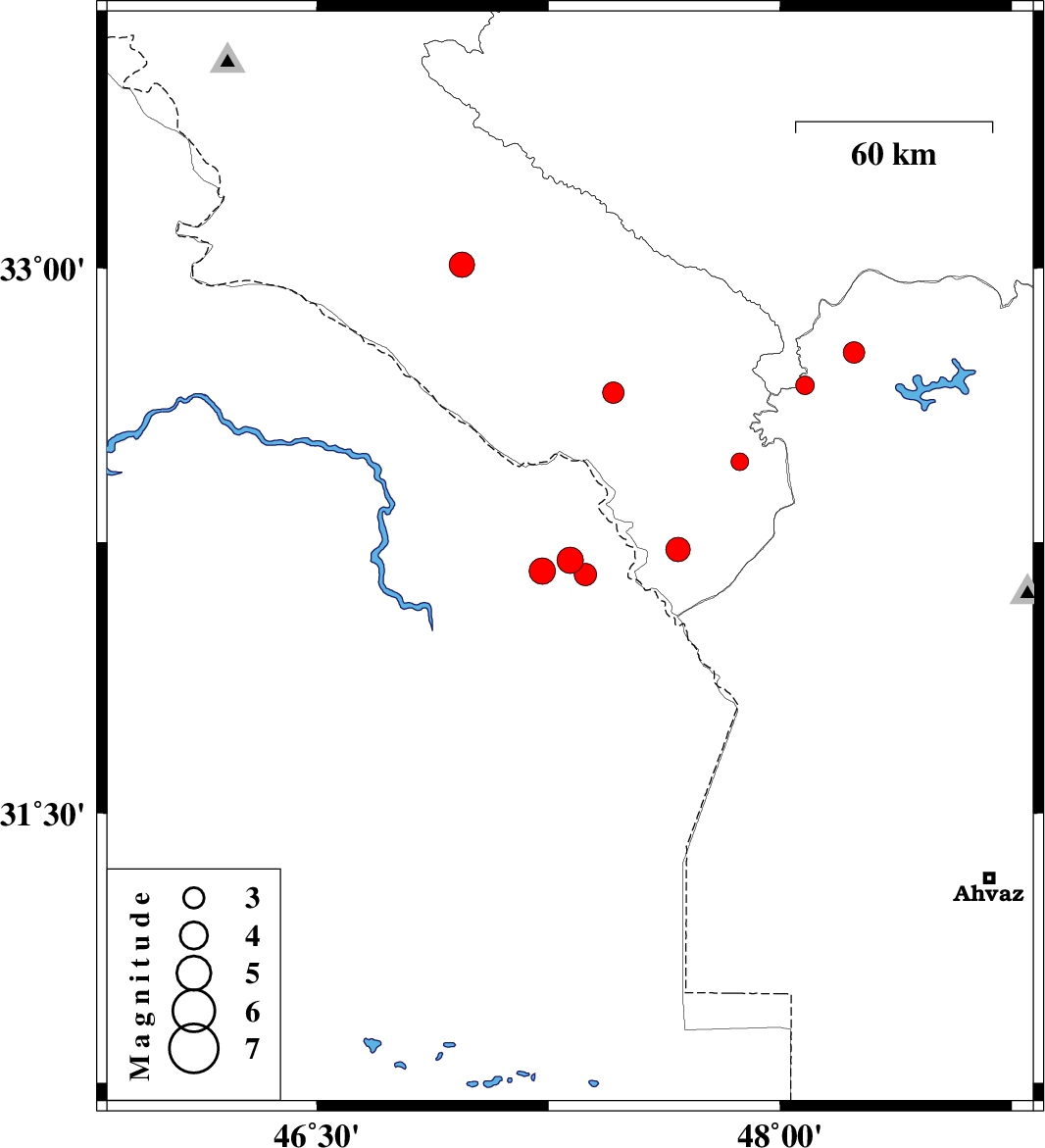 | 2008/09/29 | 14:43:44.3 | 18:13:44.3 | 32.16 | 47.37 | 14 | ML3.2 | 60 km South-East of Dehloran, Ilam Province |