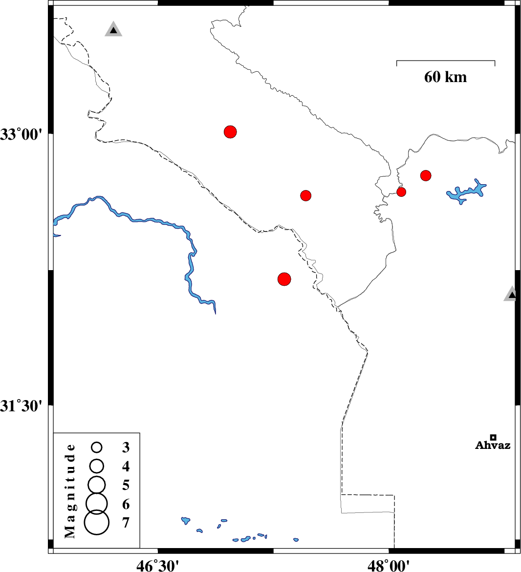 | 2008/10/26 | 05:20:25.8 | 08:50:25.8 | 32.2 | 47.32 | 43 | ML3.8 | 54 km South of Dehloran, Ilam Province | ||
