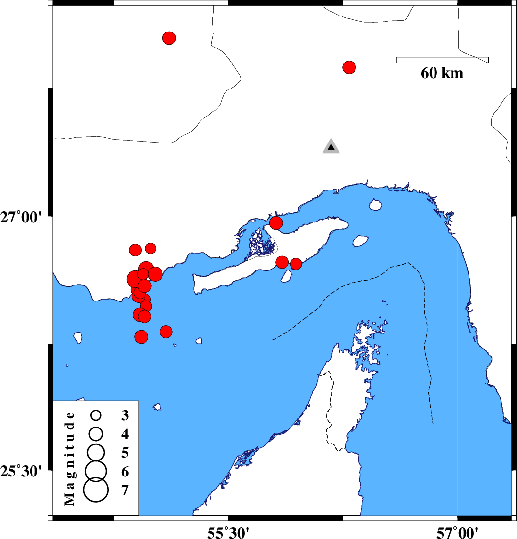 2008/10/21 | 13:11:05.1 | 16:41:05.1 | 26.32 | 55.09 | 46 | ML3.7 | Persian Gulf, 32 km South-East of Bandar-e lengeh | ||