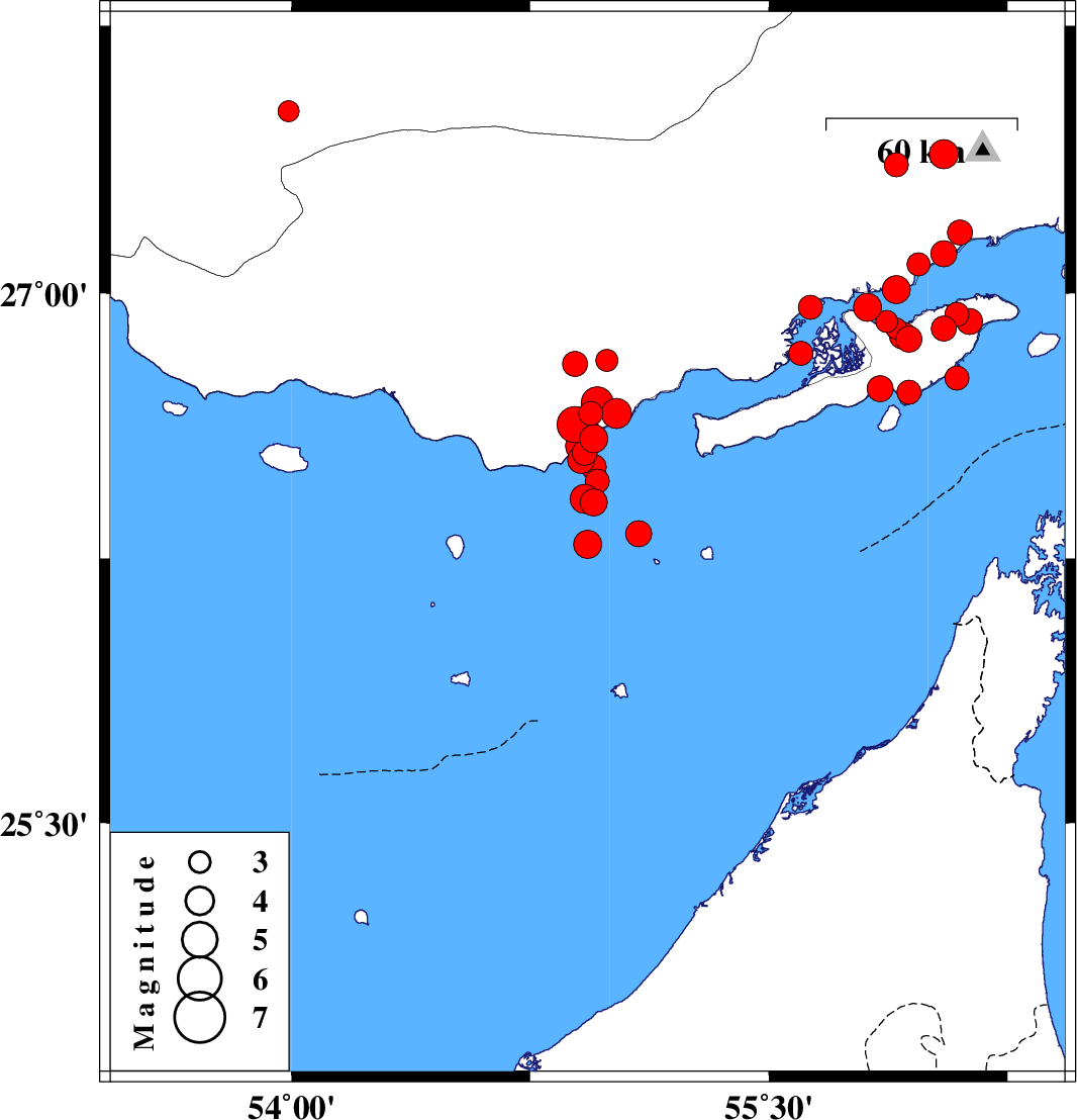 2008/09/29 | 04:30:20.5 | 08:00:20.5 | 26.9 | 55.9 | 7 | ML2.9 | Persian Gulf, 36 km West of Qeshm | ||