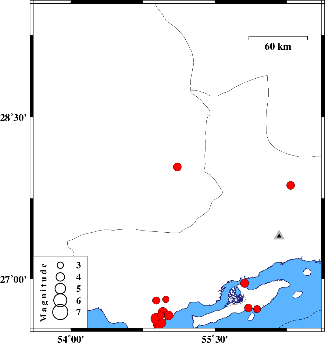 2008/10/25 | 20:17:16.9 | 23:47:16.9 | 26.63 | 54.89 | 14 | ML5.1 | 12 km North of Bandar-e lengeh, Hormozgan Province | ||