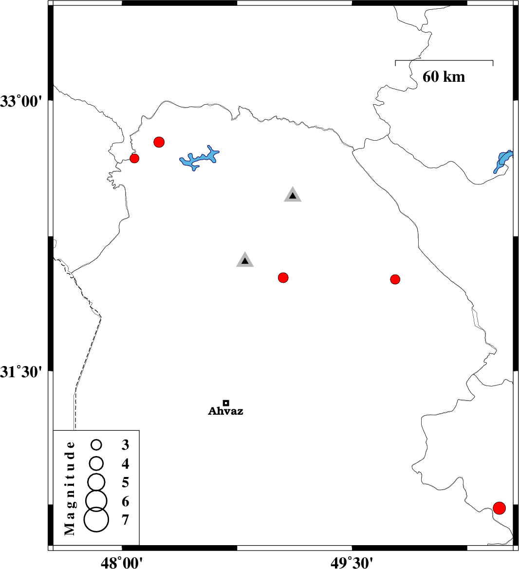 | 2008/10/27 | 19:46:03.3 | 23:16:03.3 | 32.02 | 49.05 | 14 | ML3 | 18 km East of Shushtar, Khoozestan Province | ||