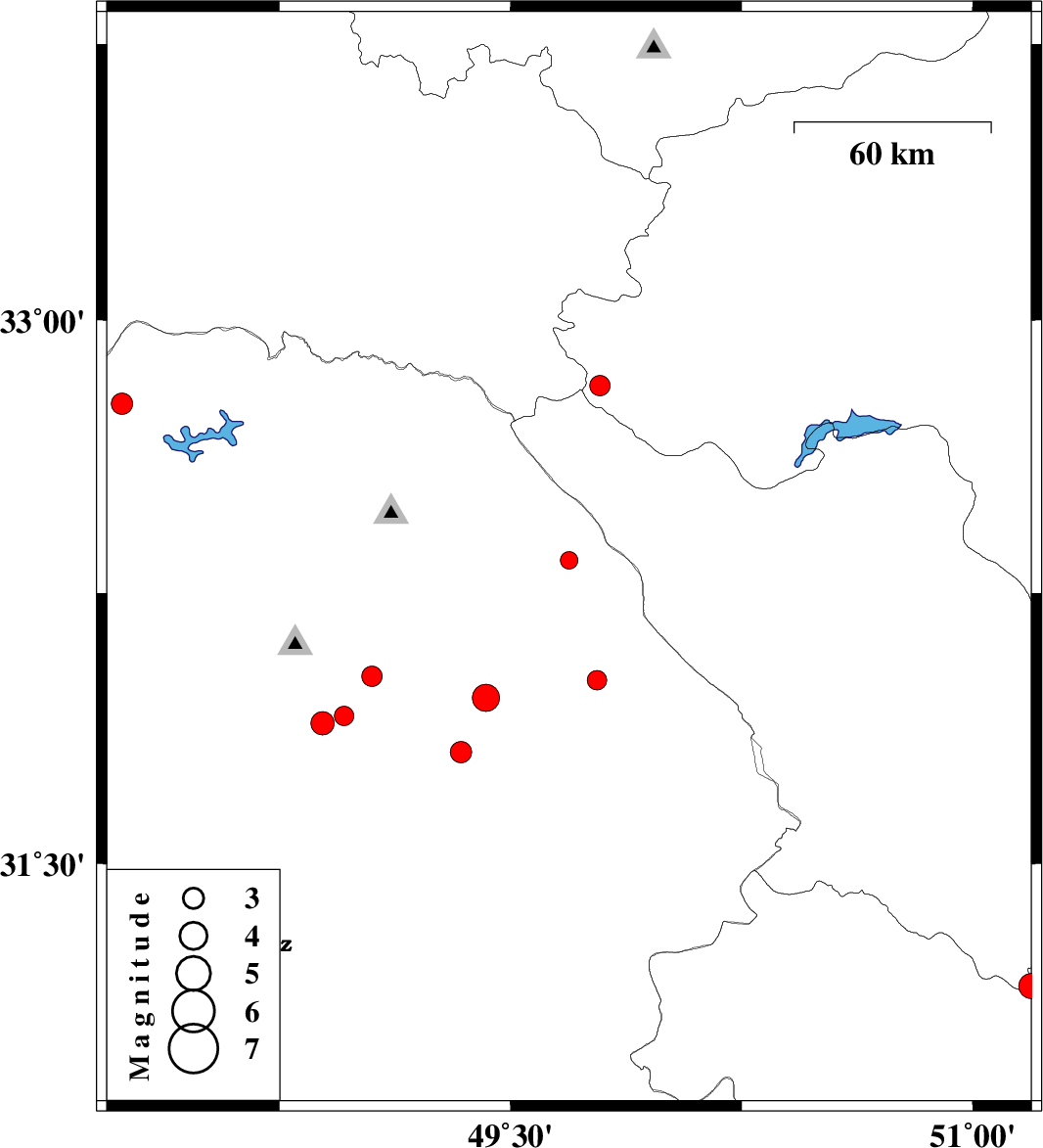| 2008/10/28 | 04:04:31.1 | 07:34:31.1 | 32.34 | 49.69 | 14 | ML2.6 | 42 km South-West of Chelgard, Chaharmahal Bakhtiari Province | ||
