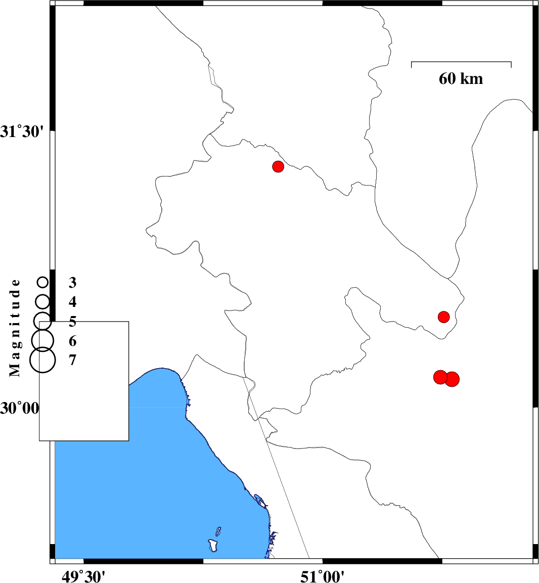 2008/10/29 | 00:46:32.5 | 04:16:32.5 | 30.67 | 50.82 | 14 | ML3.2 | 27 km South-East of Dehdasht, Kohkiluieh va boyerahmad Province | ||