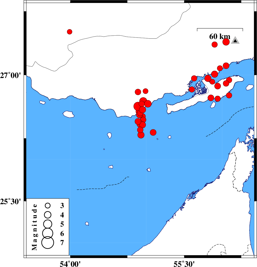 2008/10/05 | 08:17:54.9 | 11:47:54.9 | 26.83 | 55.6 | 37 | ML3.4 | Persian Gulf, 67 km South-West of Qeshm | ||