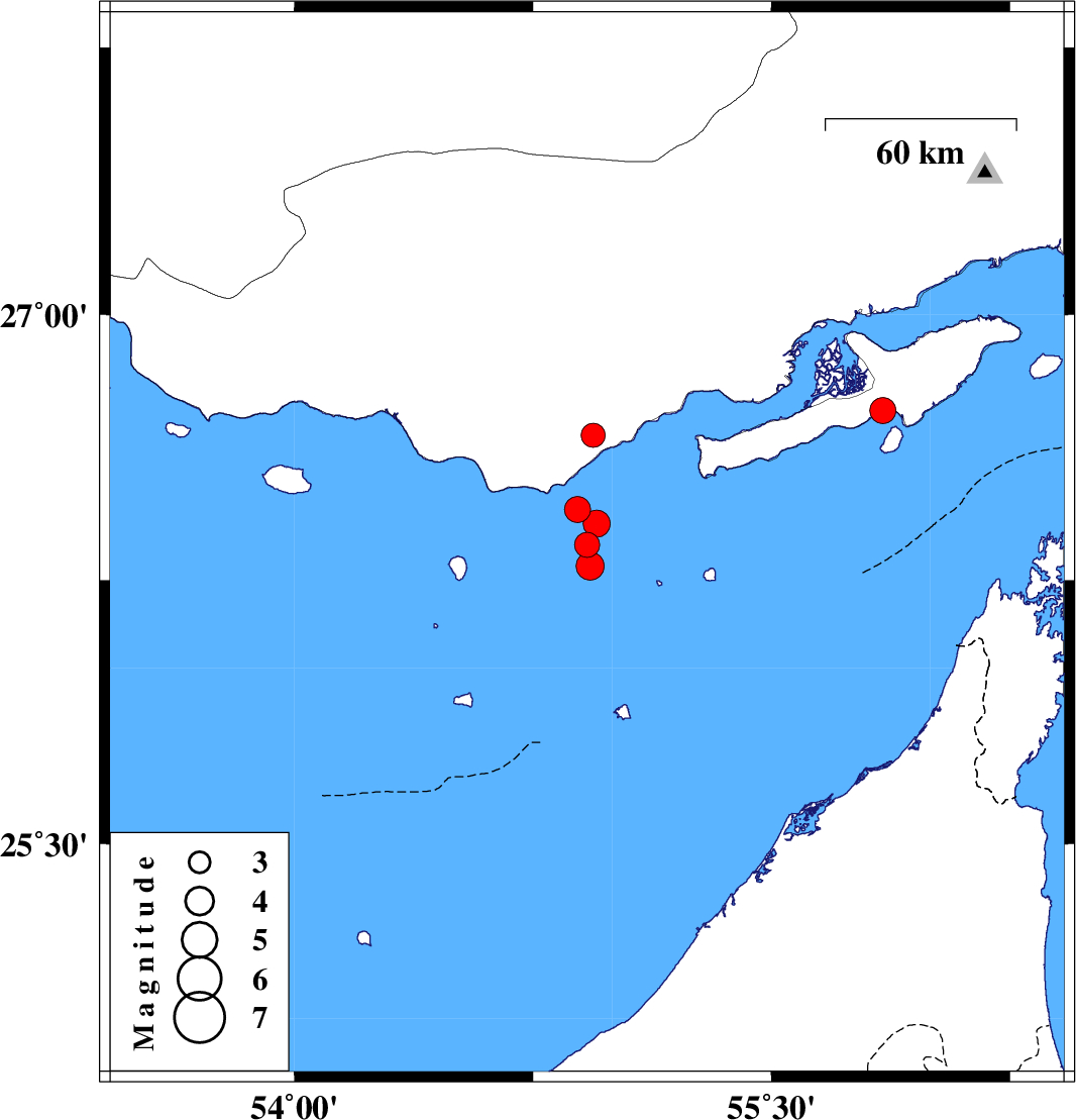 2008/11/02 | 01:20:53.8 | 04:50:53.8 | 26.35 | 54.92 | 14 | ML3.5 | Persian Gulf, 20 km South of Bandar-e lengeh | ||