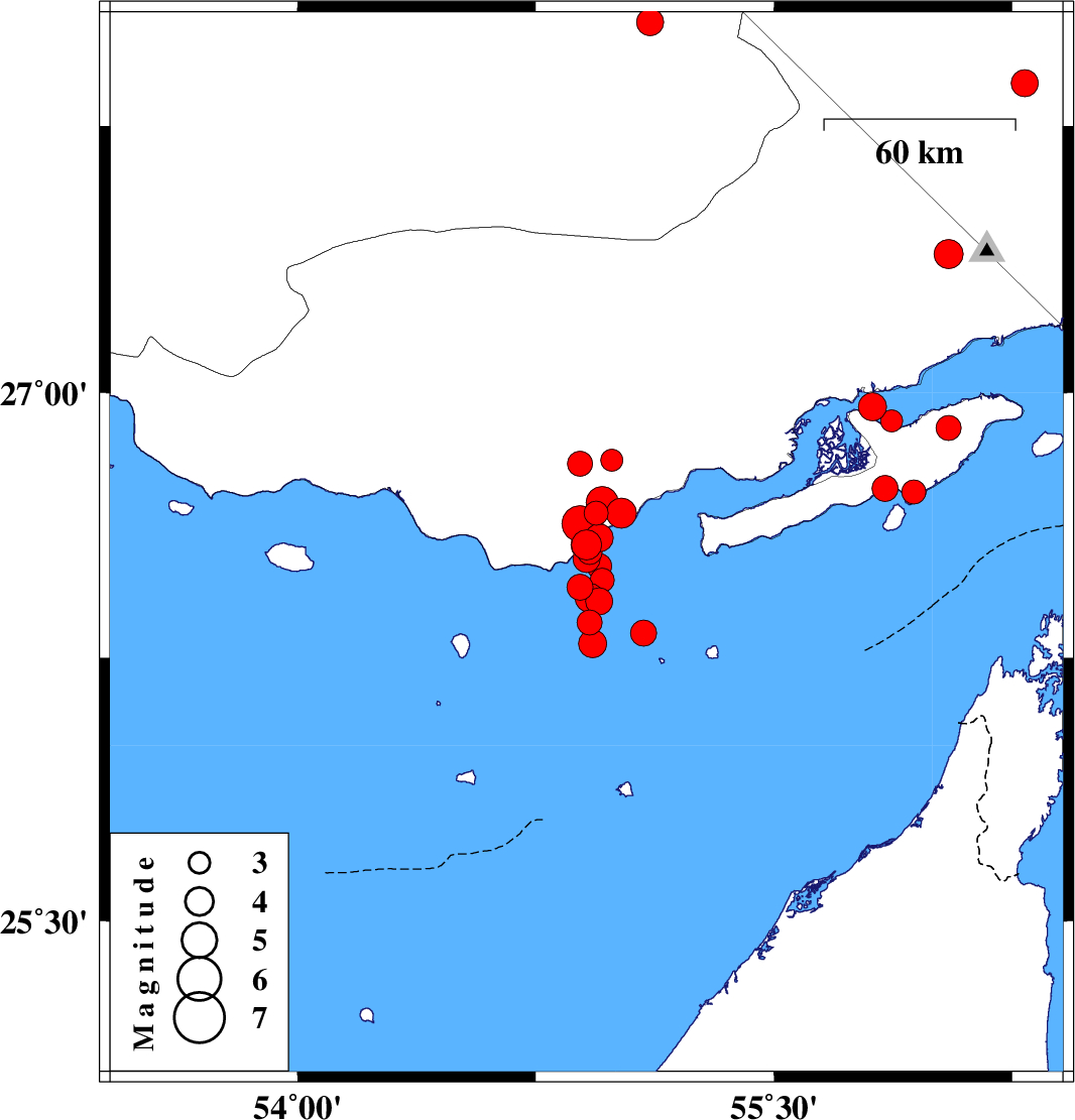 2008/10/09 | 21:49:09.1 | 01:19:09.1 | 26.9 | 56.05 | 7 | ML3.5 | Persian Gulf, 22 km West of Qeshm |