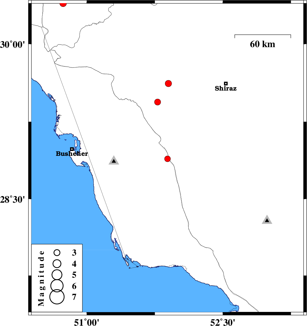 | 2008/11/05 | 09:46:57.3 | 13:16:57.3 | 29.62 | 51.9 | 15 | ML3.2 | 24 km East of Kazerun, Fars Province | ||