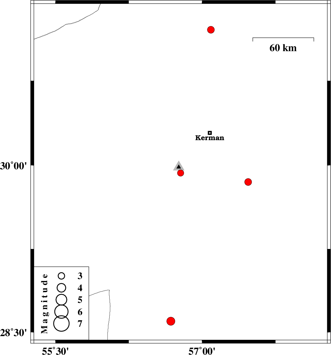2008/11/08 | 03:09:18.0 | 06:39:18.0 | 29.93 | 56.78 | 16 | ML2.9 | 19 km East of Bardsir, Kerman Province | ||