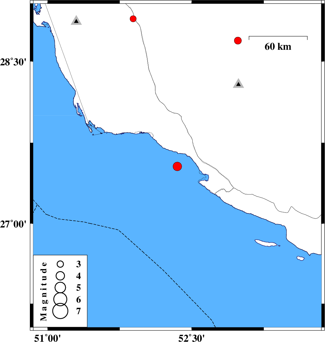 2008/11/11 | 13:51:01.1 | 17:21:01.1 | 27.53 | 52.35 | 15 | ML4.1 | Persian Gulf, 34 km South of Jam | ||
