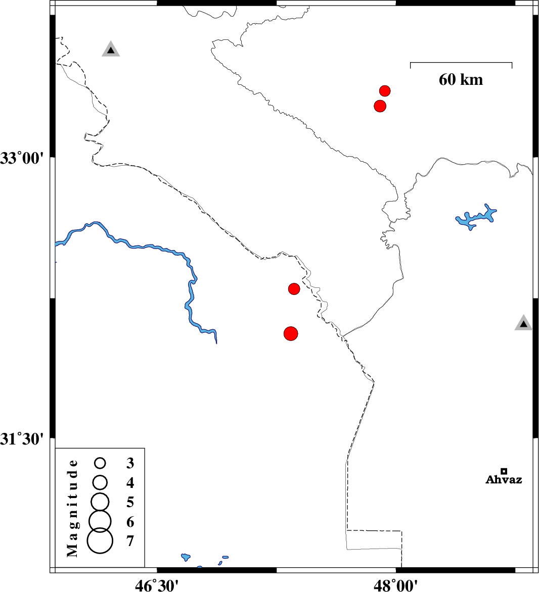 2008/11/22 | 17:50:46.5 | 21:20:46.5 | 32.06 | 47.34 | 39 | ML4 | 71 km South of Dehloran, Ilam Province |