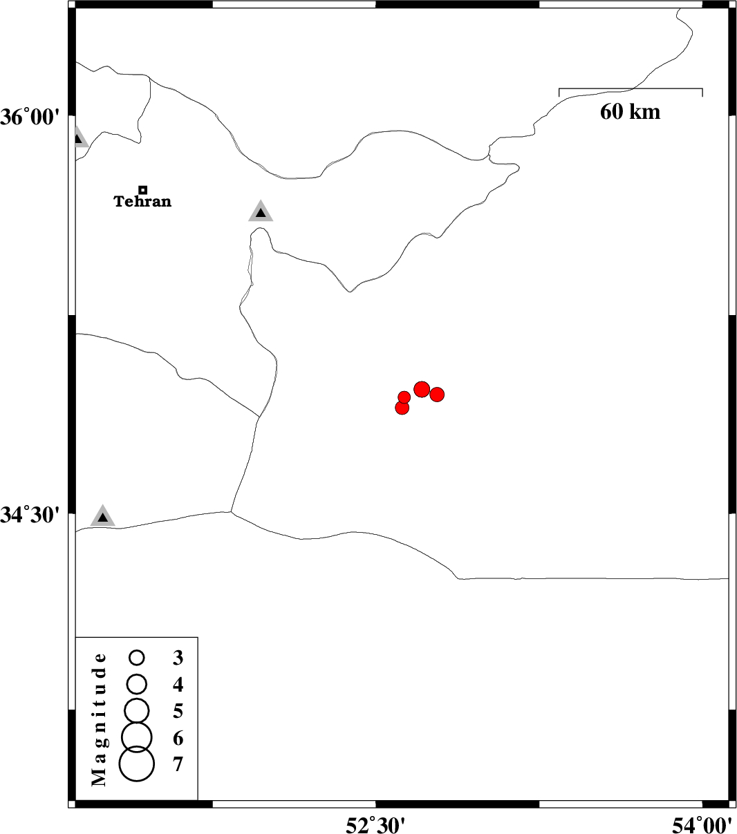 2008/11/27 23:57:01.5 03:27:01.5 34.9752.7146 ML3.3 43 km South-East of Garmsar, Semnan Province