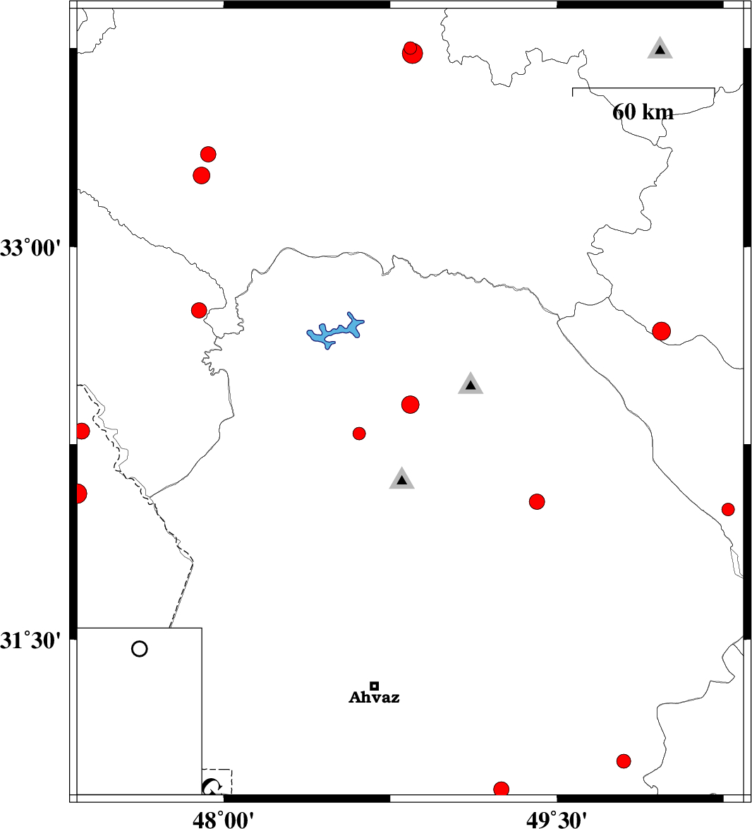 2008/11/26 | 12:44:22.4 | 16:14:22.4 | 32.3 | 47.36 | 14 | ML3.2 | 45 km South of Dehloran, Ilam Province | ||