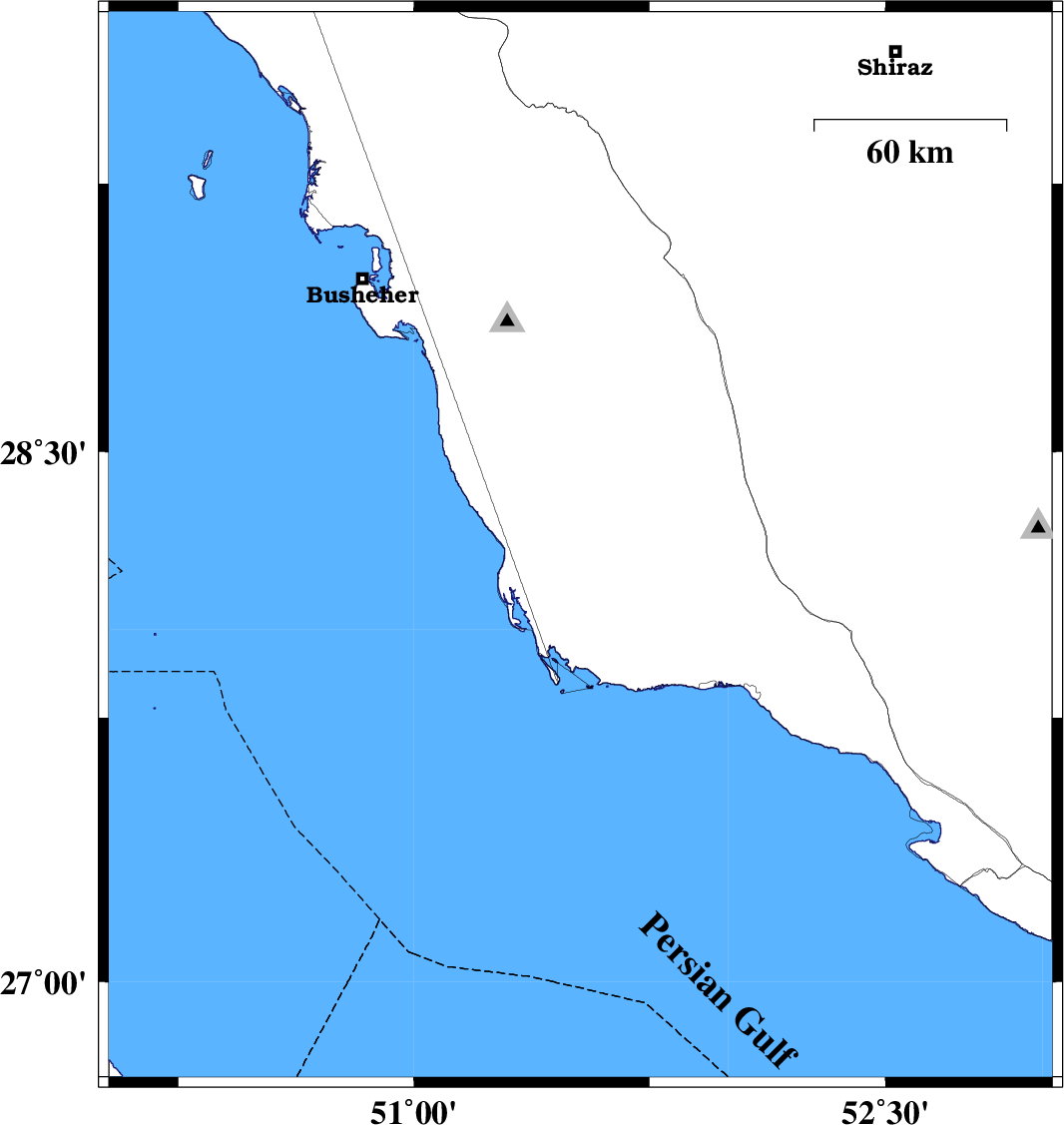 2008/11/28 | 20:16:31.8 | 23:46:31.8 | 28.23 | 51.53 | 15 | ML4.2 | 49 km South-East of Khormog, Bushehr Province |