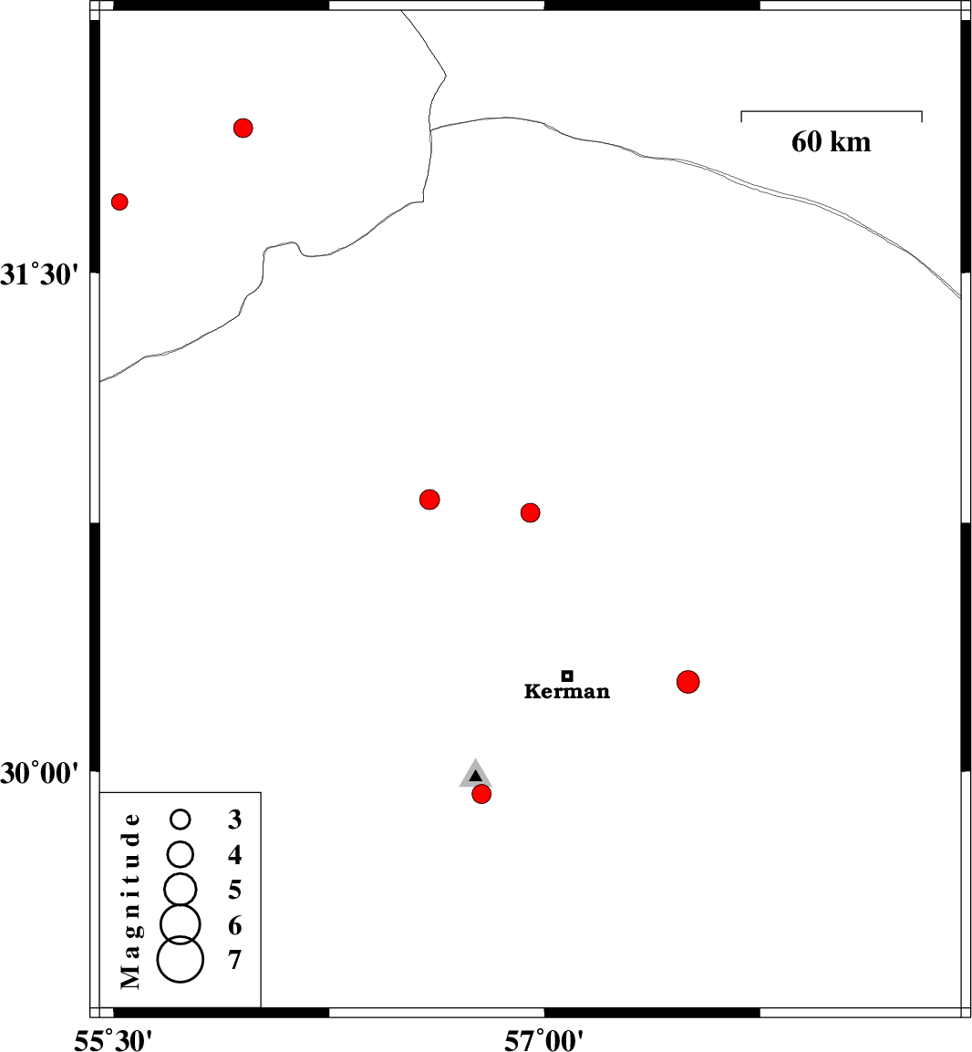2008/11/08 | 03:09:18.0 | 06:39:18.0 | 29.93 | 56.78 | 16 | ML2.9 | 19 km East of Bardsir, Kerman Province |