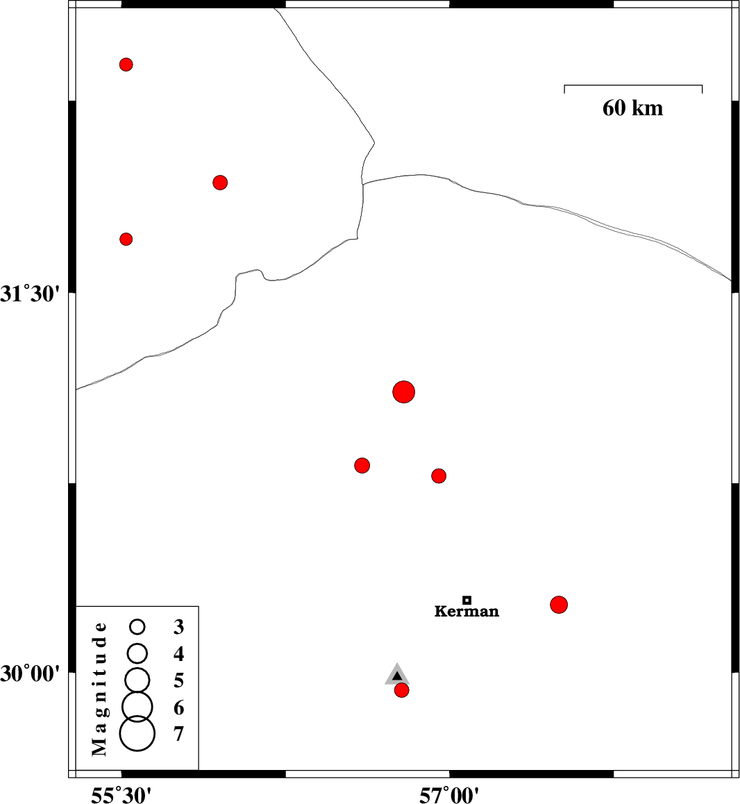 2008/11/20 | 04:14:59.2 | 07:44:59.2 | 31.93 | 55.95 | 15 | ML3 | 63 km North-East of Bafq, Yazd Province | ||