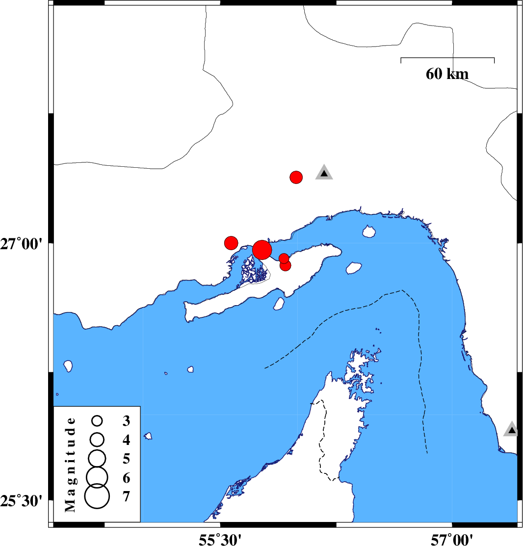 2008/12/07 | 13:36:20.8 | 17:06:20.8 | 26.96 | 55.77 | 11 | Mb5.6 | Persian Gulf, 49 km West of Qeshm | ||