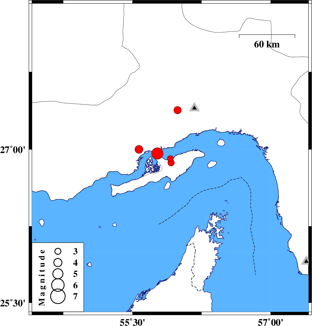 2008/12/07 | 16:22:08.4 | 19:52:08.4 | 26.91 | 55.91 | 3 | ML3 | Persian Gulf, 35 km West of Qeshm | ||