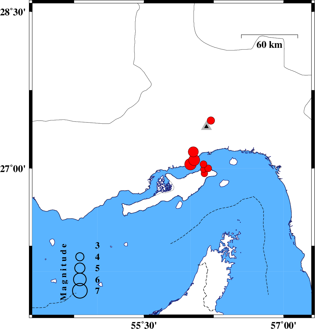 2008/12/09 | 15:09:27.4 | 18:39:27.4 | 27.08 | 55.8 | 15 | ML5 | 48 km North-West of Qeshm, Hormozgan Province | ||