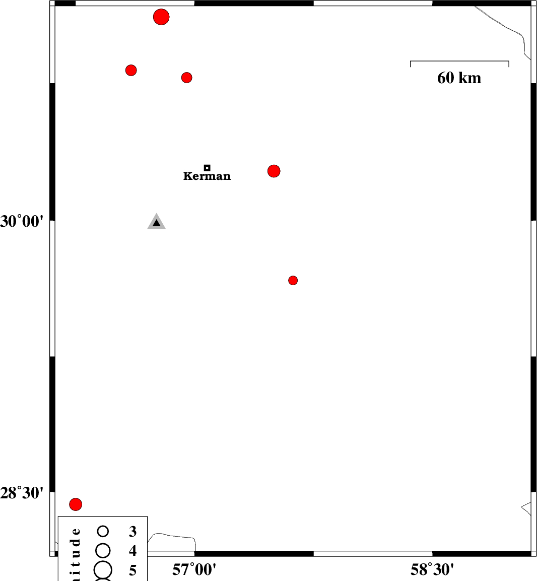 2008/12/09 | 18:50:59.9 | 22:20:59.9 | 29.67 | 57.62 | 18 | ML2.6 | 86 km South-East of Kerman, Kerman Province | ||