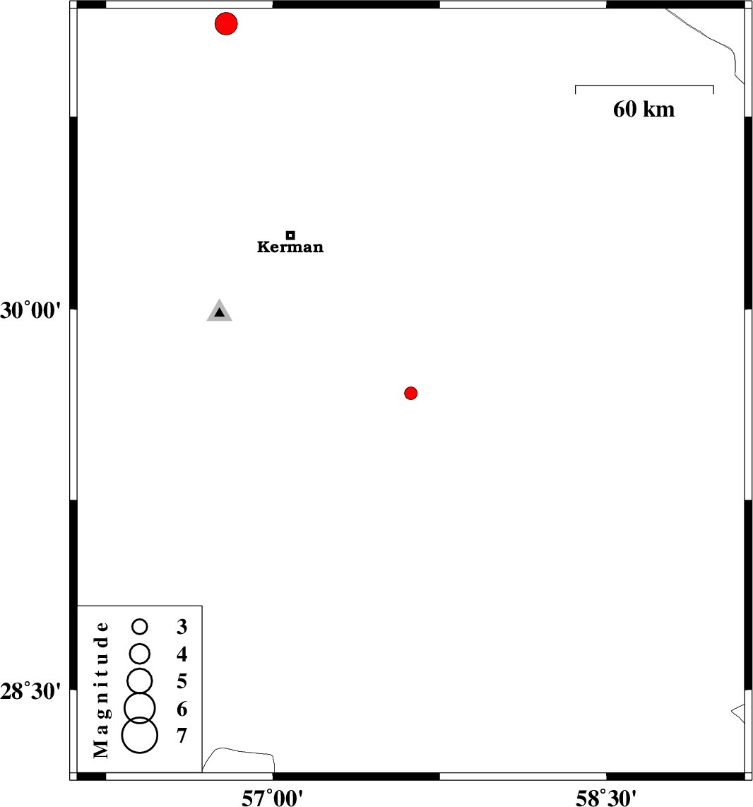 2008/12/09 | 18:50:59.9 | 22:20:59.9 | 29.67 | 57.62 | 18 | ML2.6 | 86 km South-East of Kerman, Kerman Province | ||