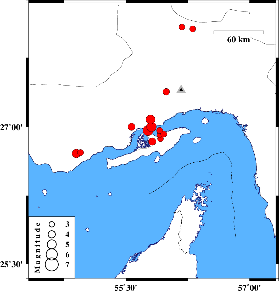 2008/12/08 | 06:44:07.3 | 10:14:07.3 | 26.96 | 55.91 | 2 | ML3.4 | Persian Gulf, 35 km West of Qeshm | ||