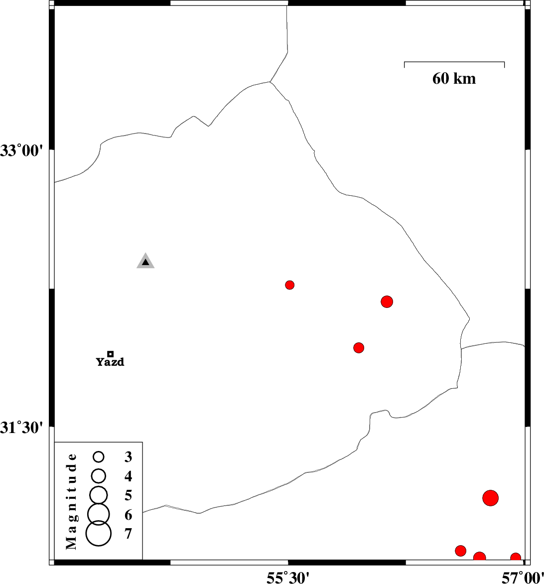 2008/11/20 | 04:14:59.2 | 07:44:59.2 | 31.93 | 55.95 | 15 | ML3 | 63 km North-East of Bafq, Yazd Province |