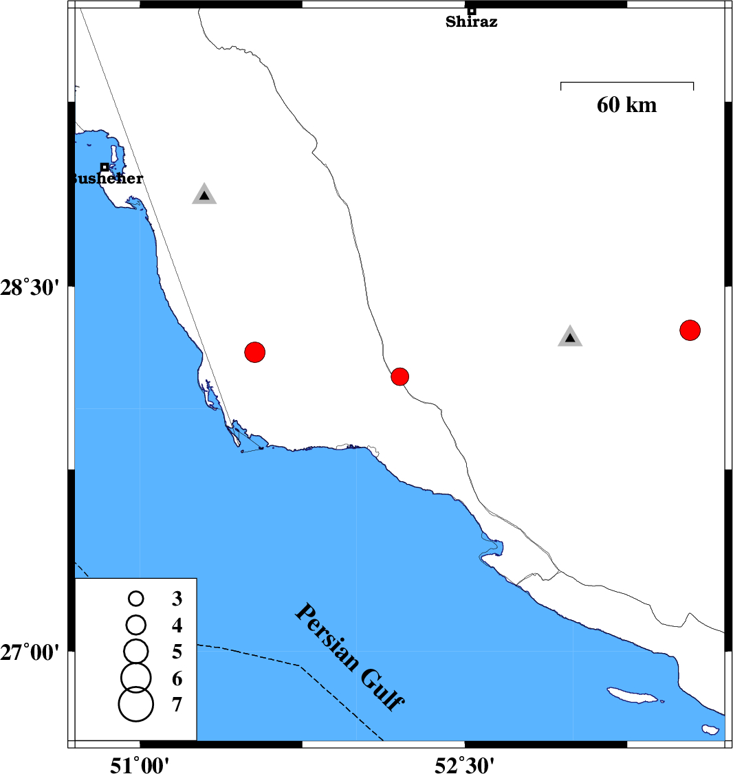 2008/11/26 | 21:25:54.4 | 00:55:54.4 | 28.32 | 53.54 | 18 | ML4.3 | 20 km South of Jahrom, Fars Province |