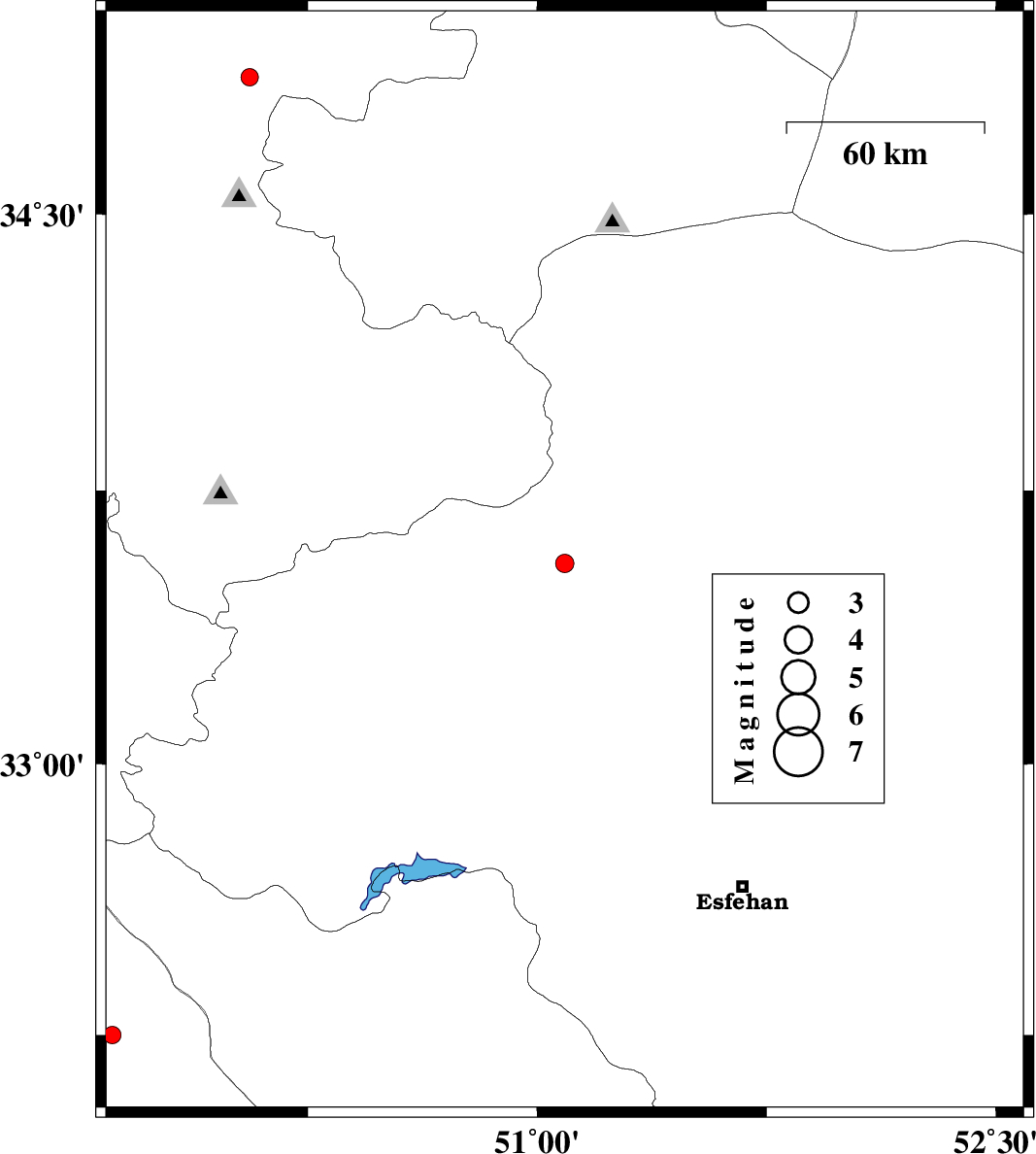 2008/12/12 | 05:04:03.0 | 08:34:03.0 | 34.87 | 50.06 | 17 | ML2.5 | 20 km North of Tafresh, Markazi Province |