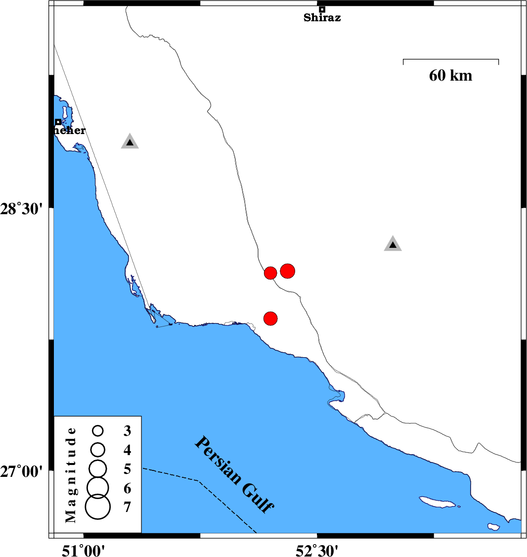 2008/12/21 | 20:39:29.4 | 00:09:29.4 | 27.87 | 52.2 | 15 | ML3.9 | 11 km West of Jam, Bushehr Province | ||