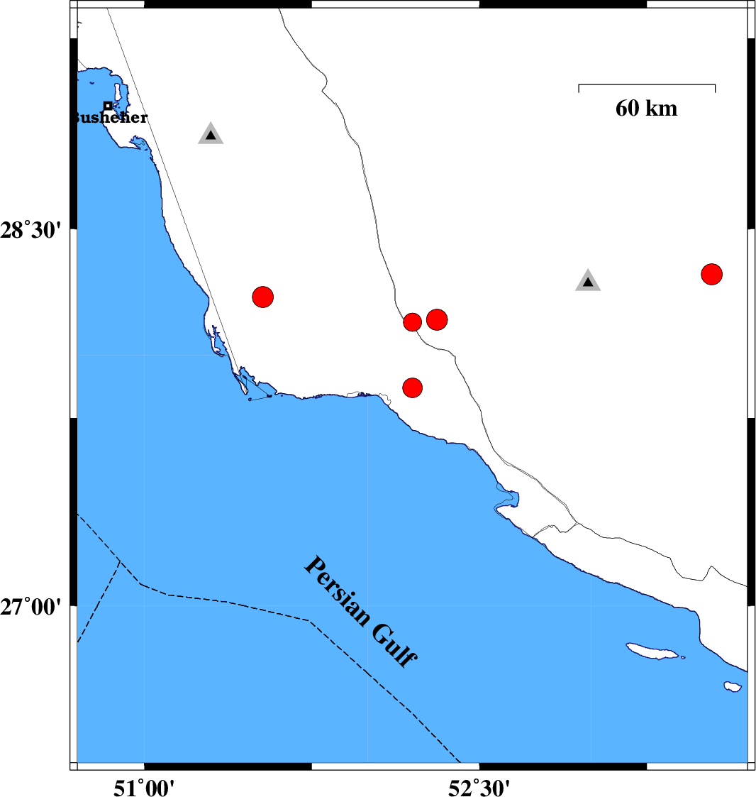 2008/12/18 19:21:20.8 22:51:20.8 28.1352.215 ML3.6 34 km North-West of Jam, Bushehr Province