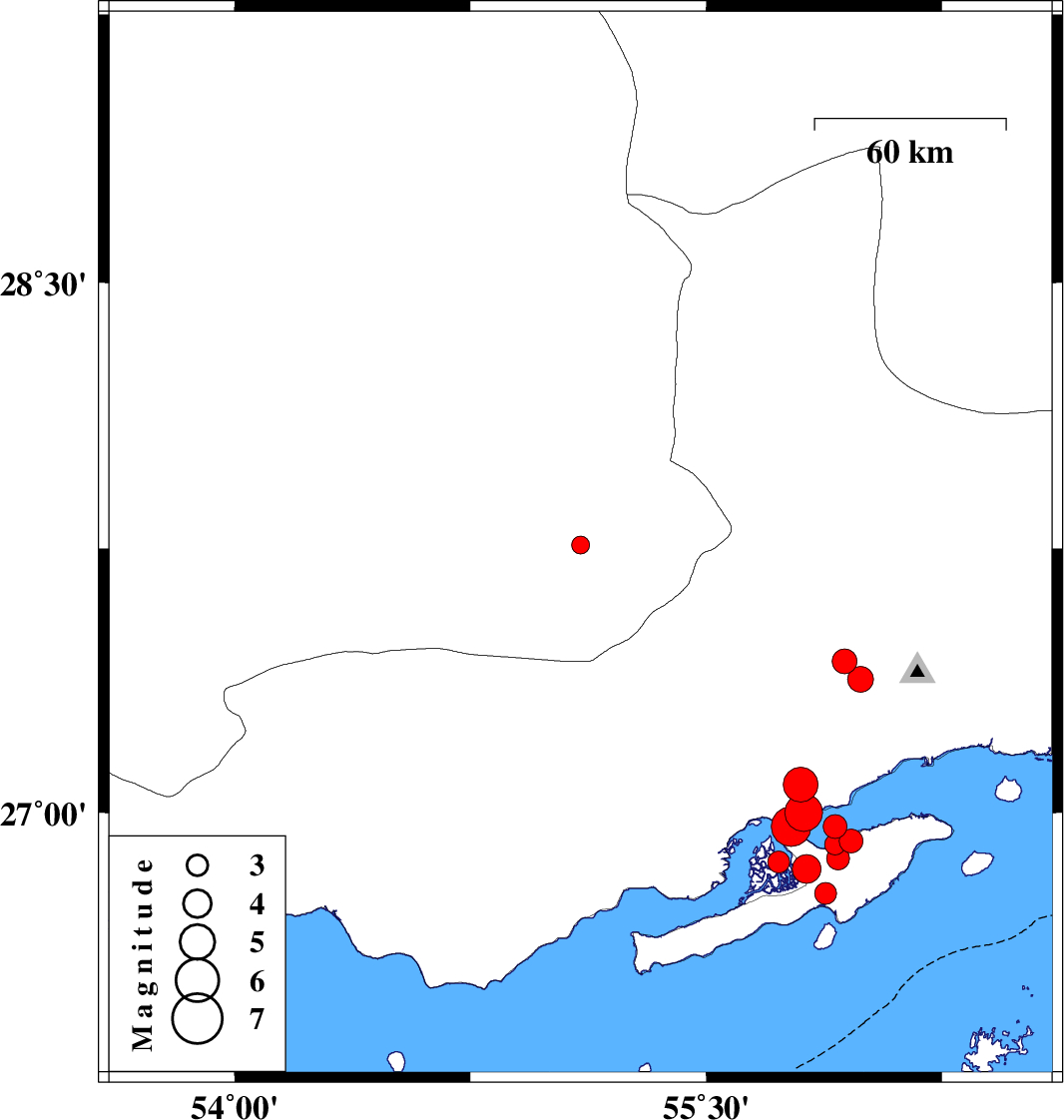 2008/12/27 | 22:58:43.9 | 02:28:43.9 | 26.86 | 55.73 | 15 | ML3.1 | Persian Gulf, 53 km West of Qeshm | ||