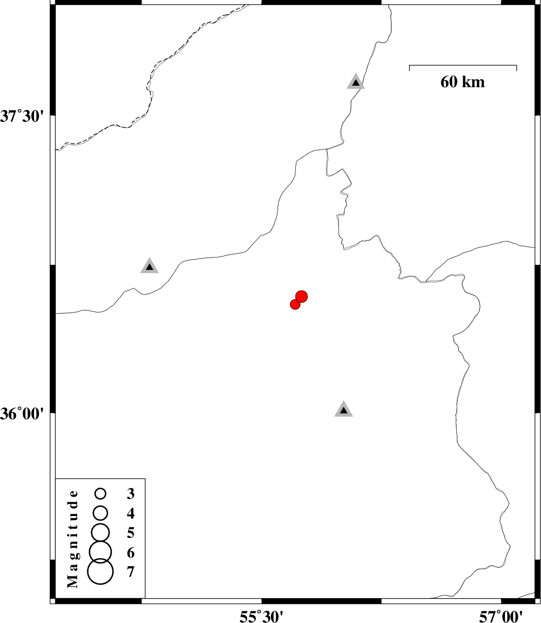 2009/01/03 | 15:08:45.7 | 18:38:45.7 | 36.59 | 55.75 | 14 | ML3.4 | 69 km South-West of Jajarm, Khorasan(north) Province | ||