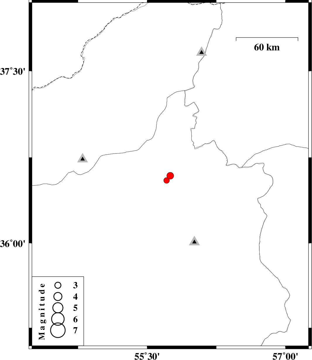 2009/01/03 | 15:08:45.7 | 18:38:45.7 | 36.59 | 55.75 | 14 | ML3.4 | 69 km South-West of Jajarm, Khorasan(north) Province | ||