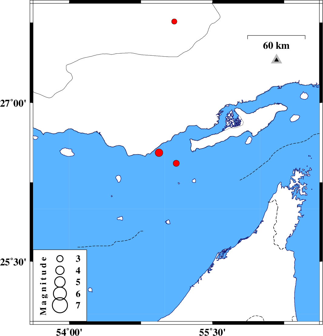 2009/01/05 | 02:23:20.8 | 05:53:20.8 | 26.53 | 54.94 | 16 | ML3.7 | Persian Gulf, 9 km Bandar-e lengeh | ||