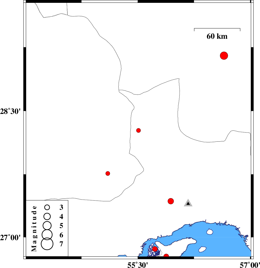 2008/12/27 | 22:58:43.9 | 02:28:43.9 | 26.86 | 55.73 | 15 | ML3.1 | Persian Gulf, 53 km West of Qeshm | ||