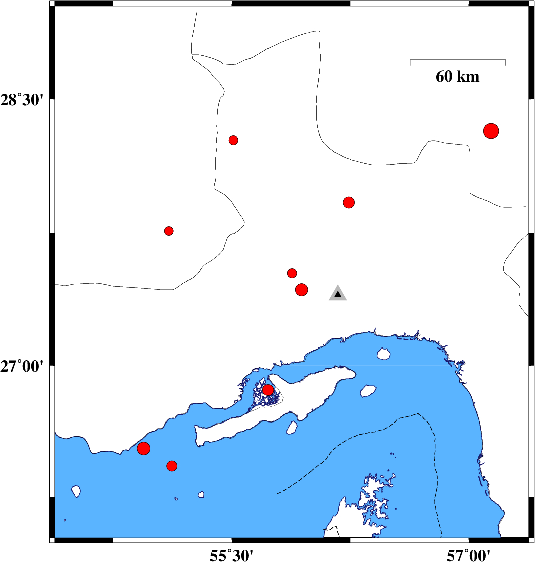 2008/12/27 | 22:58:43.9 | 02:28:43.9 | 26.86 | 55.73 | 15 | ML3.1 | Persian Gulf, 53 km West of Qeshm | ||