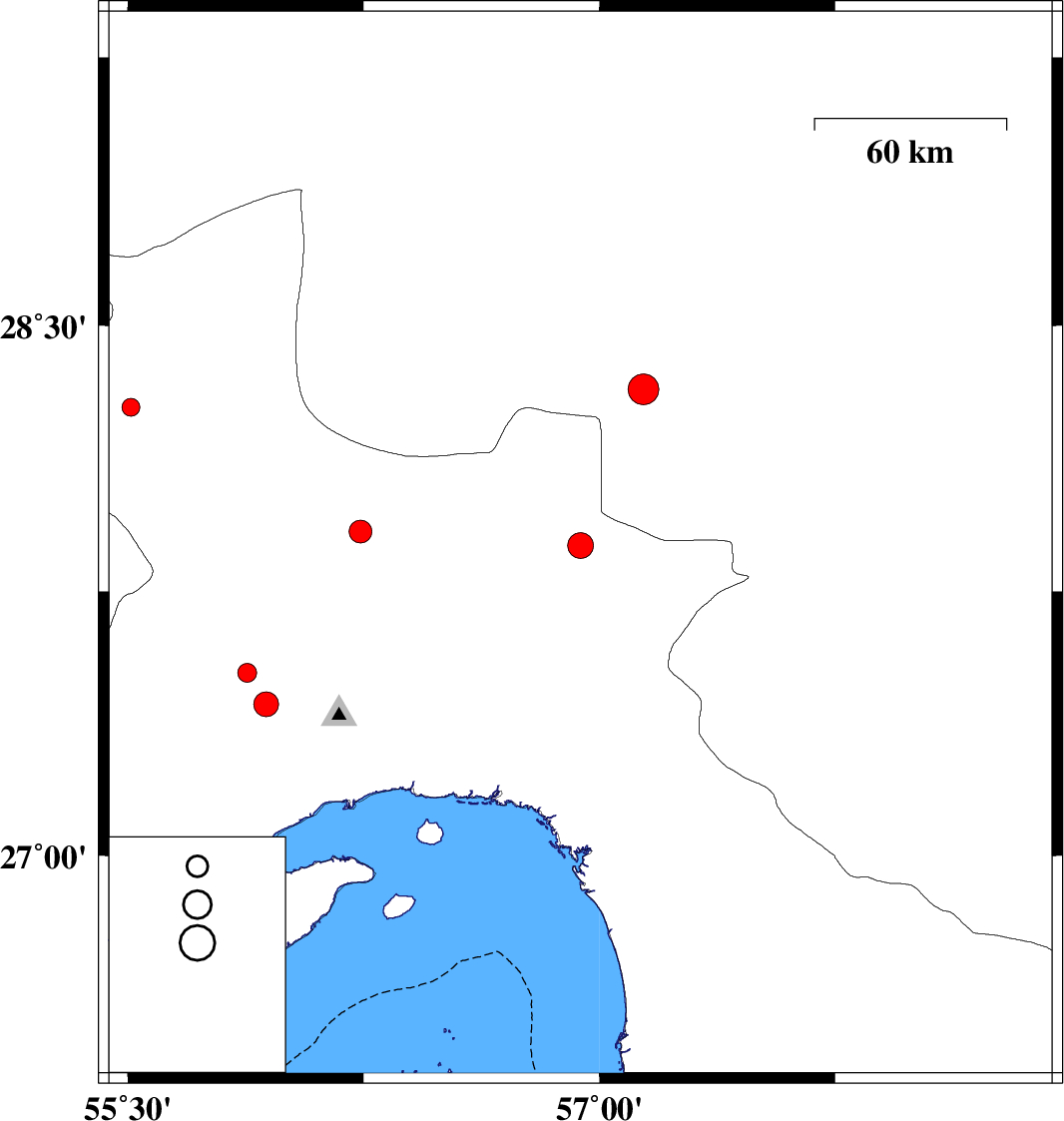 2008/12/27 | 20:29:02.9 | 23:59:02.9 | 27.43 | 55.94 | 14 | ML3.5 | 43 km North-West of Bandar-e abbas, Hormozgan Province | ||