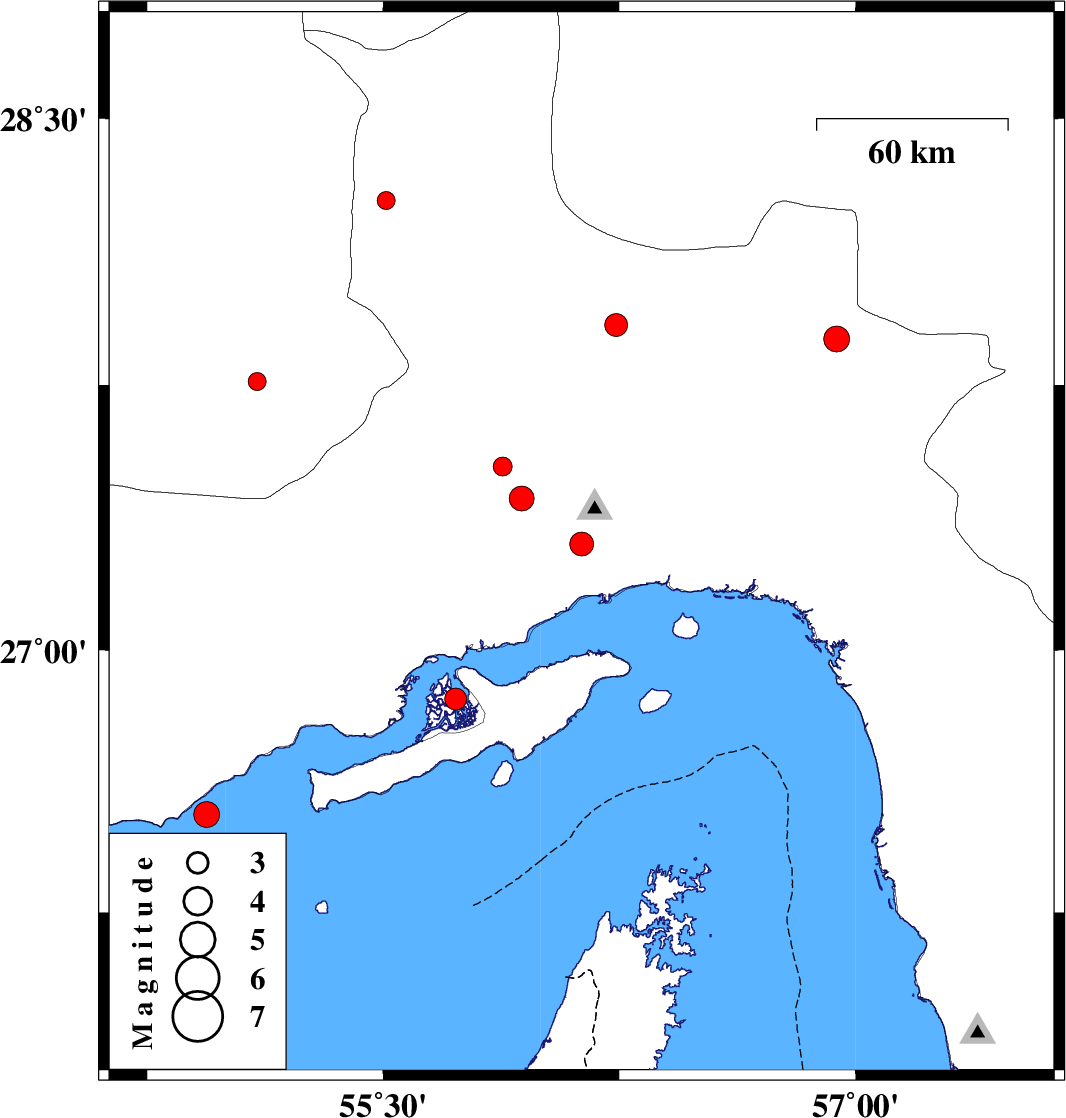 2008/12/27 | 22:58:43.9 | 02:28:43.9 | 26.86 | 55.73 | 15 | ML3.1 | Persian Gulf, 53 km West of Qeshm | ||