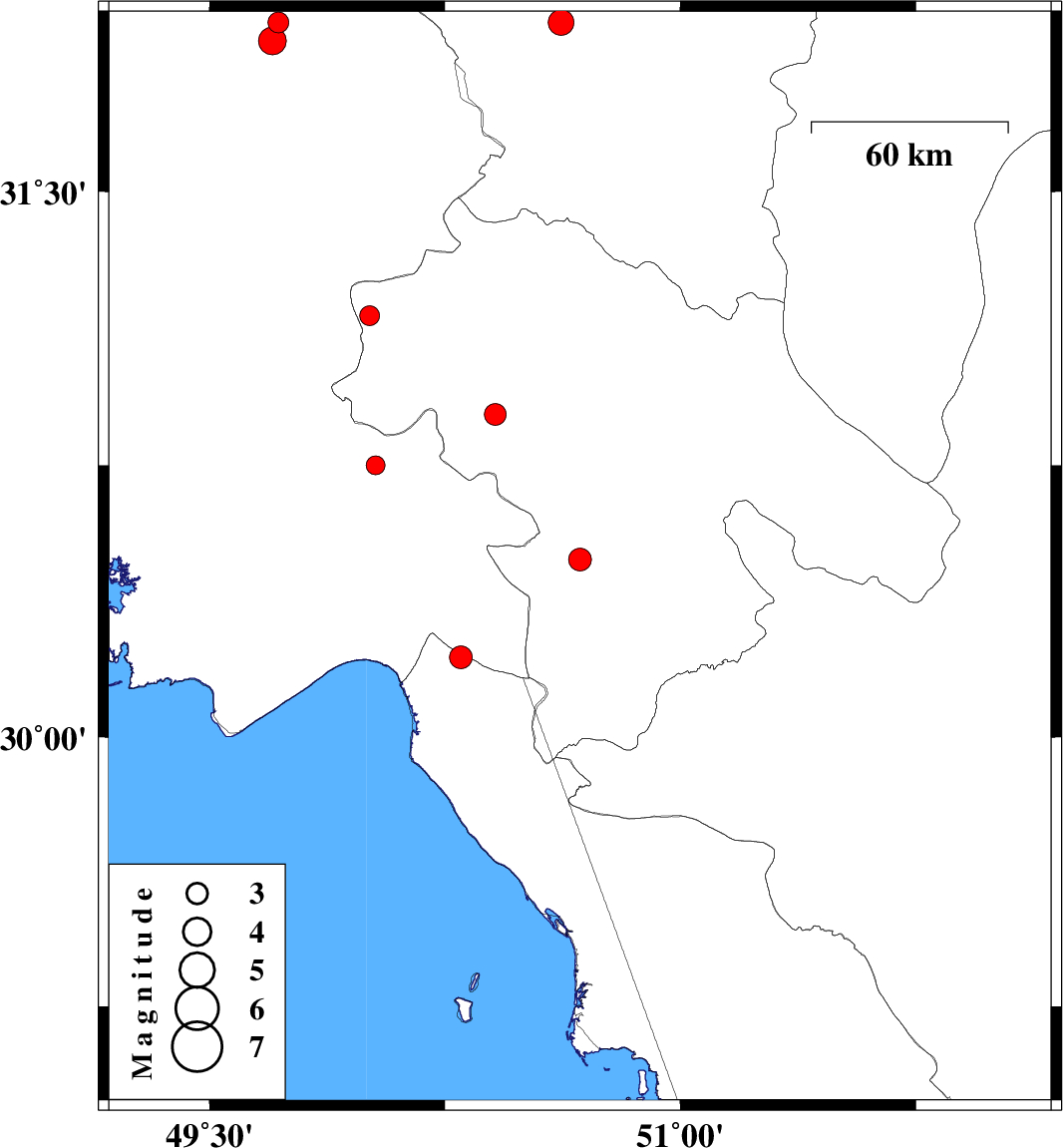 2009/01/07 | 01:19:01.3 | 04:49:01.3 | 31.91 | 49.7 | 45 | ML4 | 17 km West of Izeh, Khoozestan Province | ||