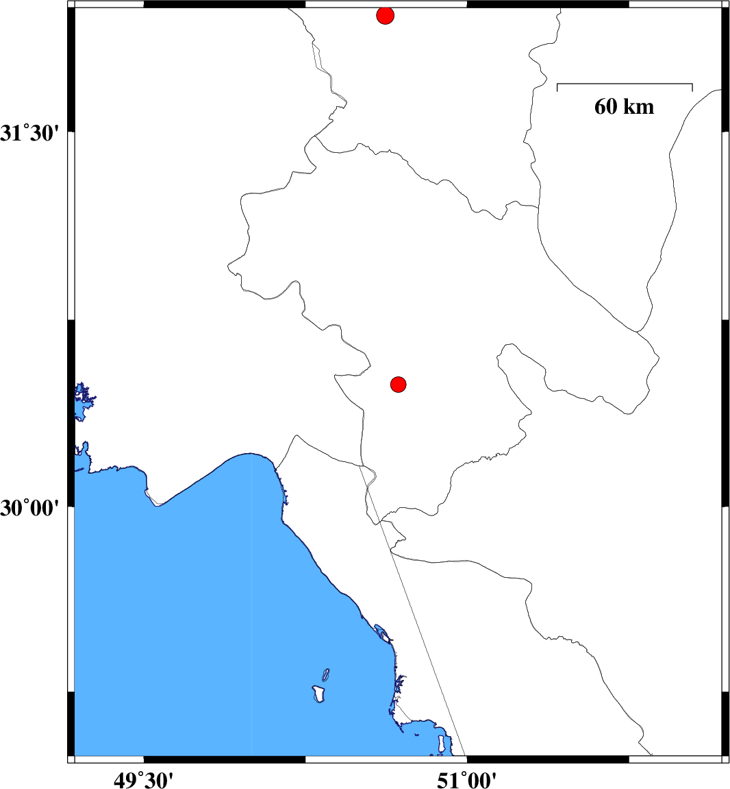2009/01/28 | 16:44:50.2 | 20:14:50.2 | 30.49 | 50.68 | 13 | ML3.3 | 18 km North-West of Dogonbadan, Kohkiluieh va boyerahmad Province | ||