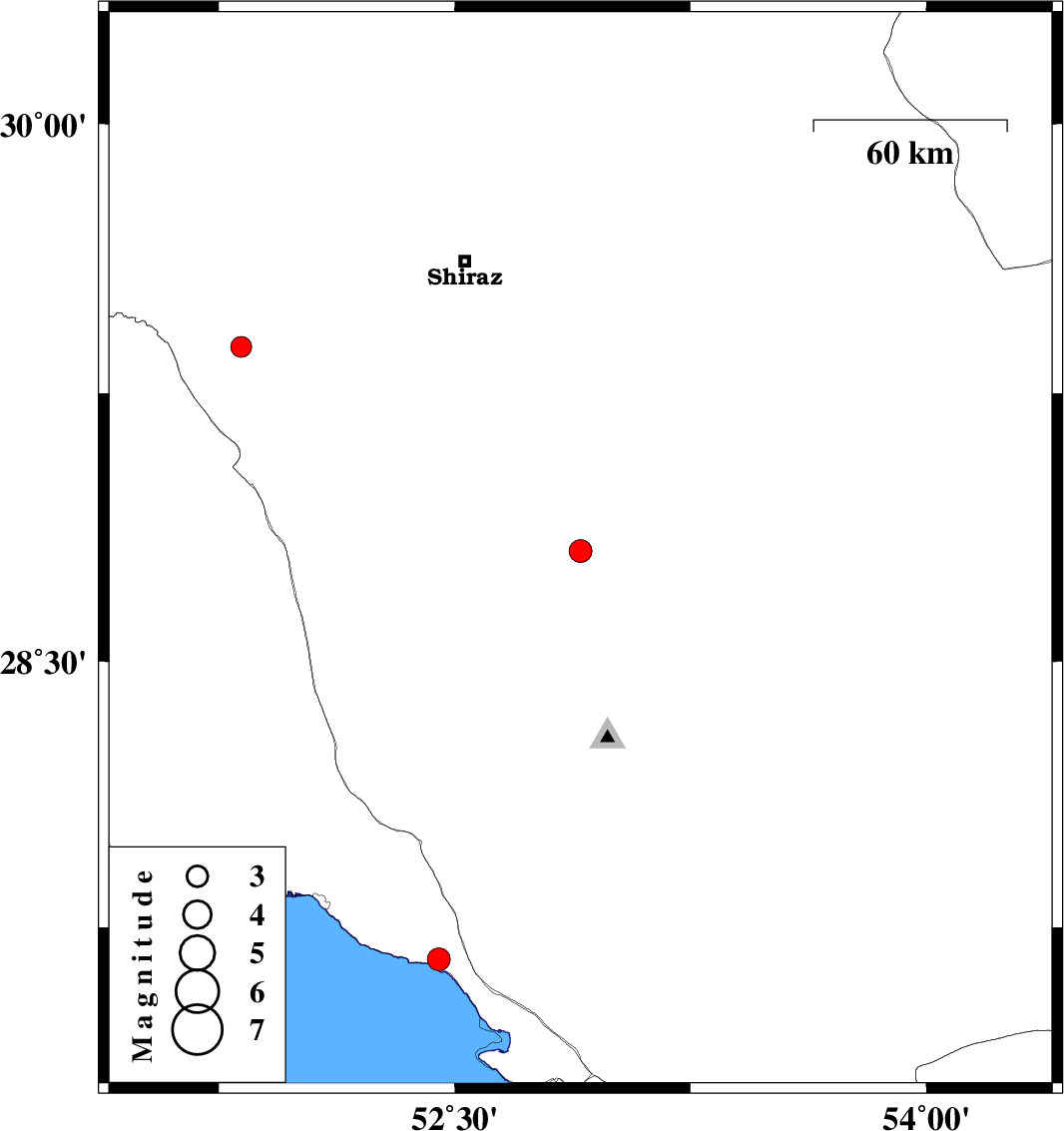 2009/01/29 | 23:50:32.3 | 03:20:32.3 | 29.38 | 51.82 | 18 | ML3 | 31 km South-East of Kazerun, Fars Province | ||