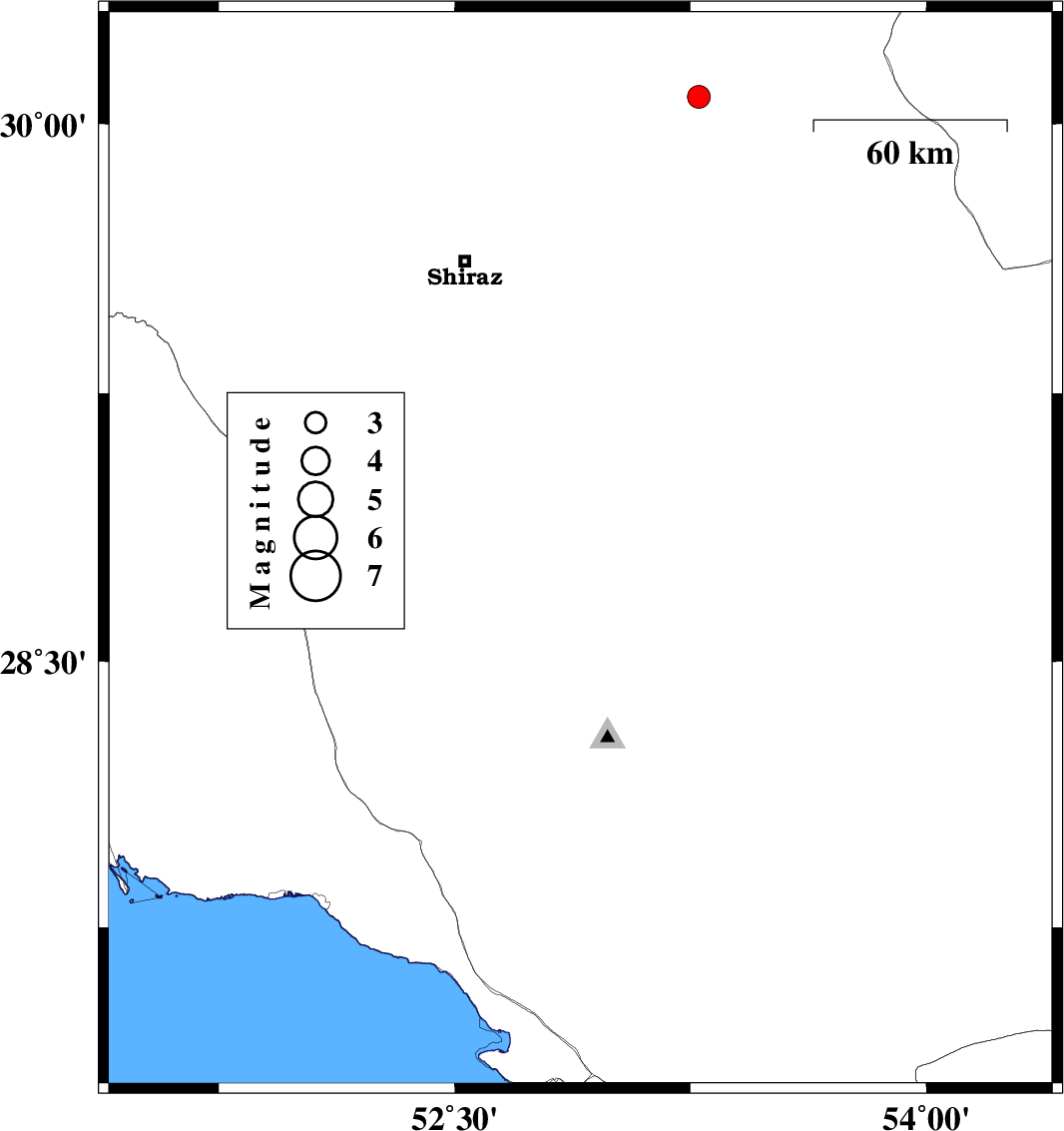 2009/01/29 | 23:50:32.3 | 03:20:32.3 | 29.38 | 51.82 | 18 | ML3 | 31 km South-East of Kazerun, Fars Province |